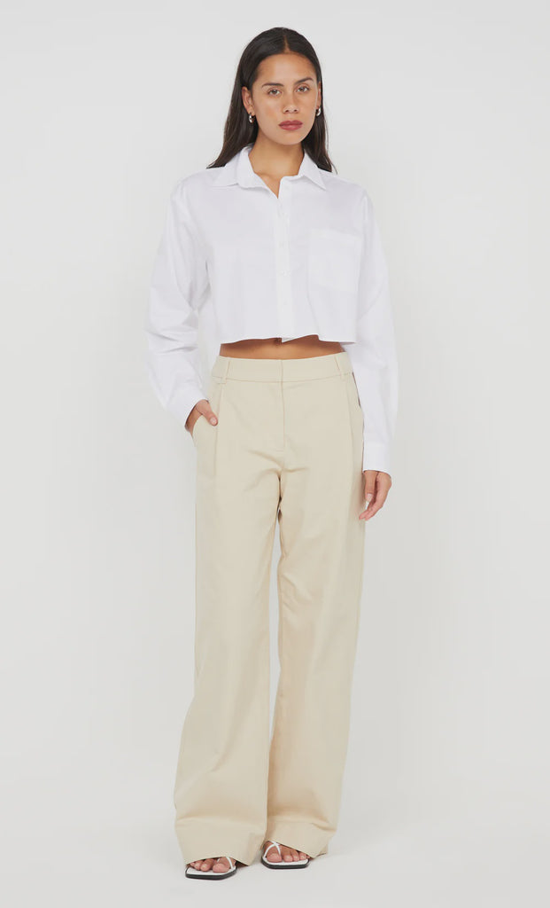 The BEC + BRIDGE Dune Shirt in White is a cropped, boxy shirt made from cotton poplin, featuring a single patch pocket, back yoke with pleats, and a center-front button placket. This relaxed, oversized style is finished with a narrow turned-up hem, making it ideal for casual layering or pairing with BEC + BRIDGE Kelsi Pant for a chic, effortless look that transitions seamlessly from weekday to weekend.