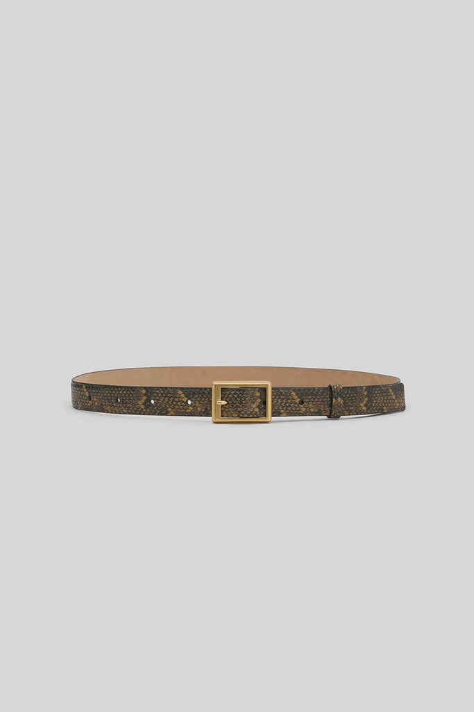 CAMILLA AND MARC Sonny snake effect leather belt in tan with square gold buckle.