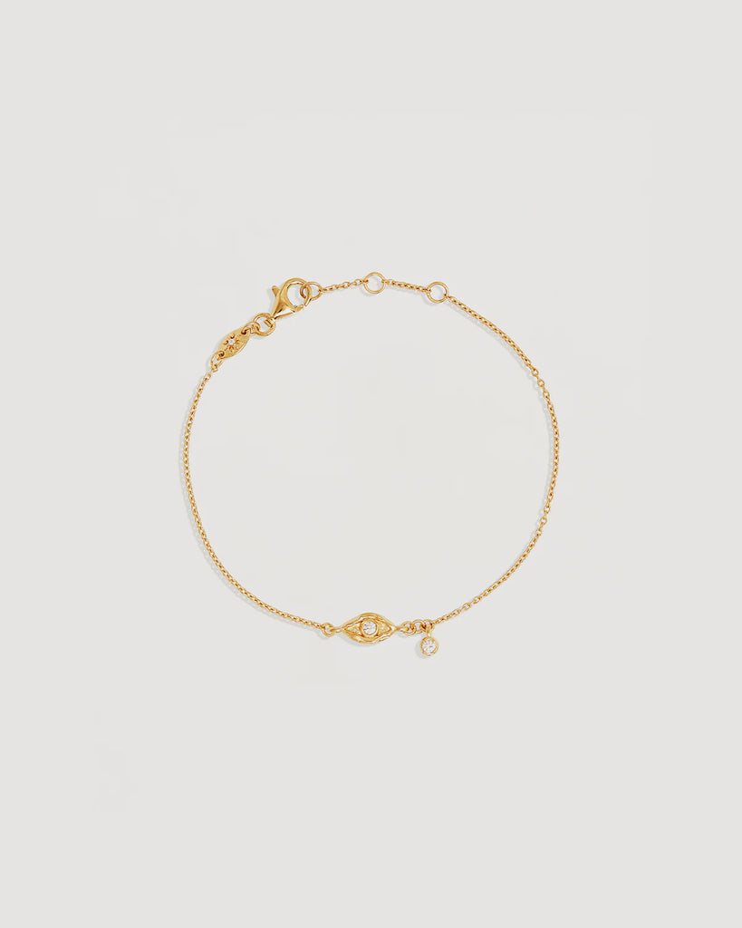 Our delicate 18k Gold Vermeil I Am Protected Bracelet is a talisman of protection, warding off negative energy and misfortune. Featuring an evil eye pendant with a battered finish, this dainty bracelet is equally meaningful and beautiful, shielding you against the unknown of the universe.