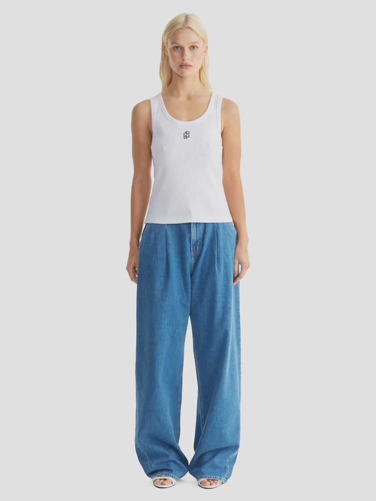 The Kendall Monogram Tank in white is a fashion-forward basic that combines style and comfort. Crafted from a soft cotton blend, this tank offers a firm but comfortable stretch fabrication and features out embroidered Ena Pelly monogram logo, designed in-house.