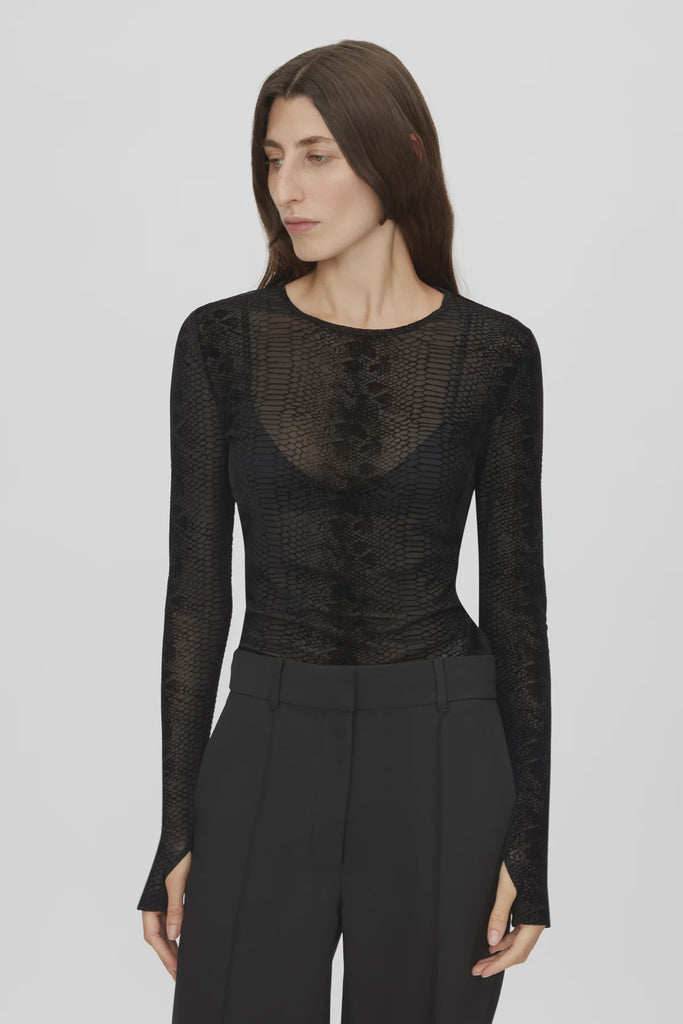 The Figue Long Sleeve Top features a striking flocking animal print on a sheer mesh fabric, offering a bold and stylish look. Designed with a crew neckline and thumbholes, it provides a modern and functional silhouette. Ideal for layering, this top combines comfort with a contemporary design.