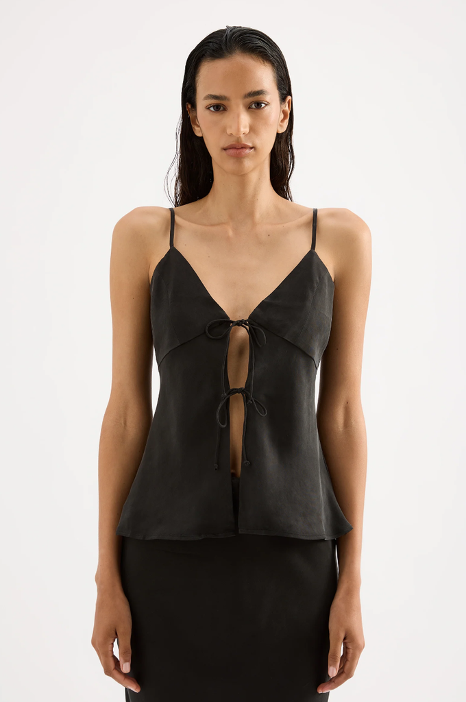 The Linnea Cupro Cami is made in our signature cupro fabrication which has a soft, sueded hand feel. The silhouette has fitted bodice cups and relaxed through the body with length finishing at the hips. Features include plunge v-neckline, front tie closure and thin adjustable straps.