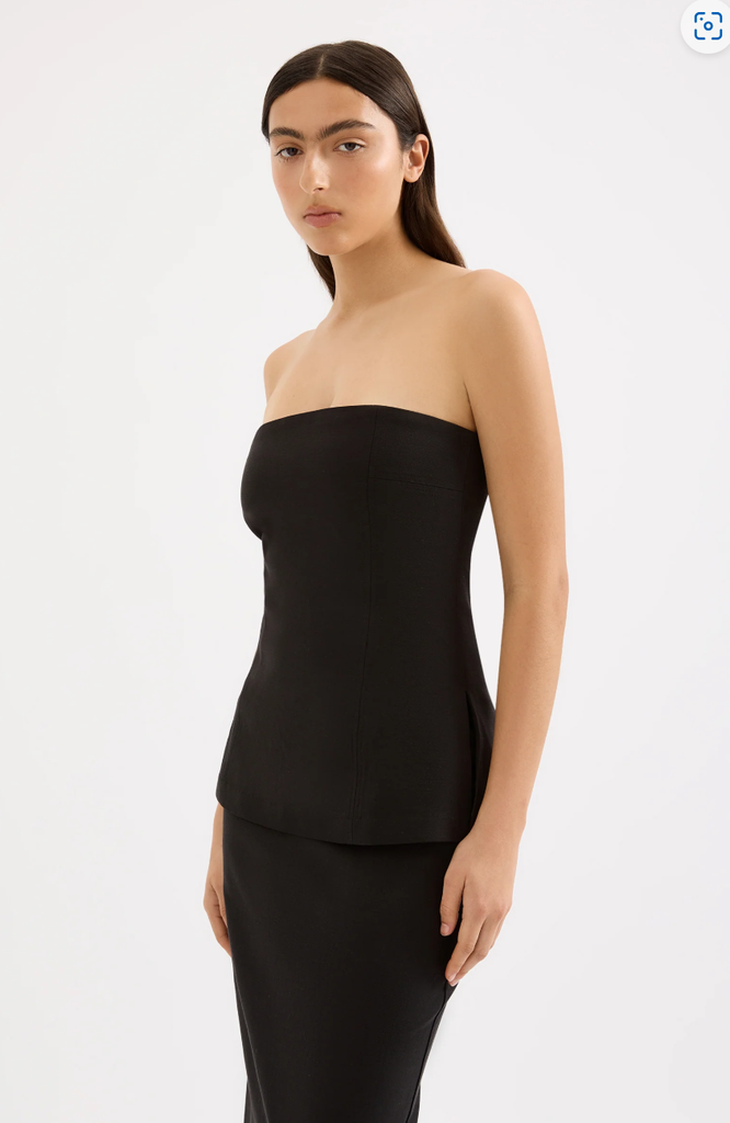 The Tait Top is made from a mid weight Tencel/cotton fabrication which has a textured hand feel. The silhouette is a strapless bodice with tailored panel lines and side seam splits. Features include tailored panel lines, side splits and a centre back zipper opening. This garment is fully lined.