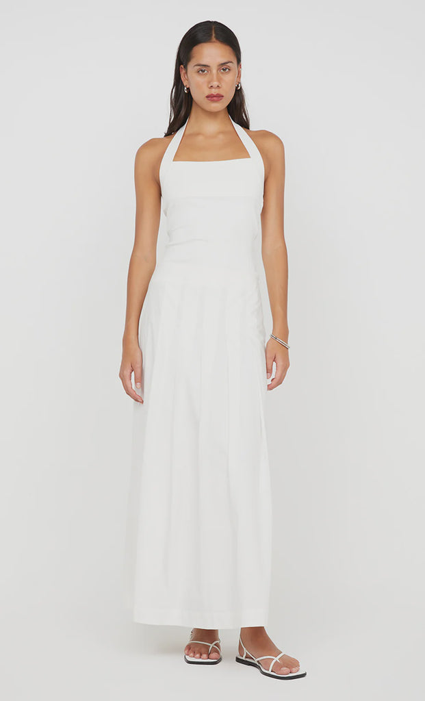 The BEC + BRIDGE Skyler Halter Top in White is a sleek, heavy knit halter top with a wide neckband and straight neckline. Featuring an under bust seam and open back, it’s designed for a fitted silhouette that hugs the body. The fabric offers stretch for a comfortable fit, and the hem finishes at the low waist, making it perfect for both casual and dressier occasions. Pair with BEC + BRIDGE Yana Maxi Skirt for an chic and effortless look.