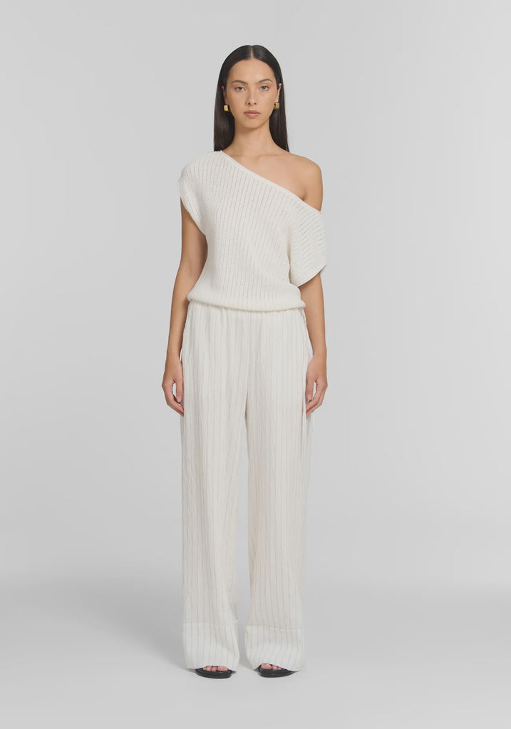 The Redford Trouser, realised in a lightweight, fluid textile with a neutral stripe, introduces a fresh calm to modern dressing. Designed with a relaxed wide-leg profile, an elasticated waist, exposed tie detail, and pockets, it delivers an effortless summer staple. Pair with the Friendship Top for a look of considered ease, designed for the holiday season.